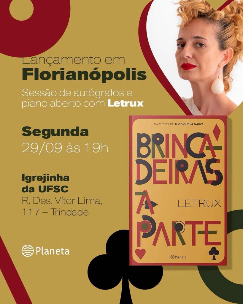 A persona artística de Letrux é marcada por uma linguagem intensa, poética, irônica e confessional — características que se refletem fortemente em seus livros e na sua música. Em Brincadeiras à parte, obra lançada pela Editora Planeta, a autora compartilha contos que exploram jogos e brincadeiras, abordando temas como sexualidade, feminismo, música, autoconhecimento, amizade e relacionamentos. O livro será lançado no dia 29 de setembro, na Igrejinha da UFSC, a partir das 18h, com entrada gratuita para o público.